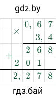 - Отделить запятой столько цифр справа, сколько их стоит после запятой в обоих множителях вместе. В числе $3.4$ одна цифра после запятой, в числе $0.67$ — две. Всего $1 + 2 = 3$ цифры.