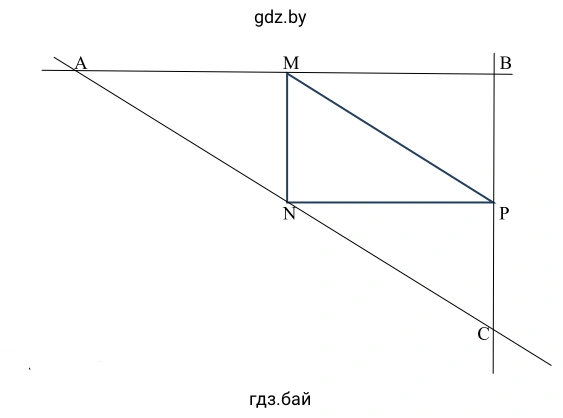 Начнем с того же прямоугольного треугольника $MNP$ с $\angle N = 90^\circ$. Условие "проведите прямые, перпендикулярные сторонам" можно истолковать как построение перпендикуляров из вершин $M$ и $P$ к гипотенузе $MP$ (единственной стороне, которая является общей для этих двух вершин).